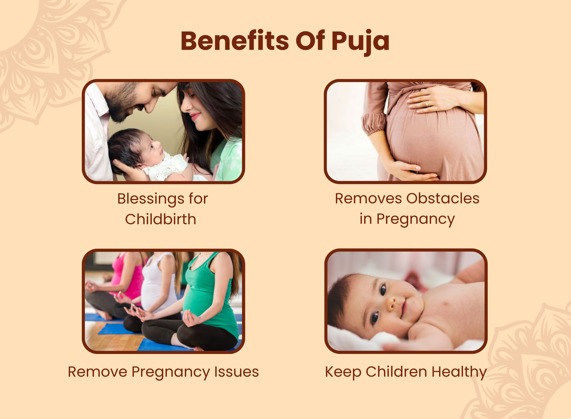 For Blessings of Childbirth, Healthy Progeny and Fulfilment of Parenthood. Is divya puja ke madhyam se safe pregnancy aur maa–bachche ki acchi health ke liye Bhagwan ka aashirwad prapt hota hai.Yeh puja jaldi santan sukh dene aur ghar mein khushiyan lane ke liye bahut shubh maani jaati hai.