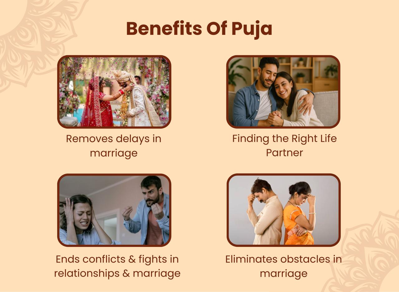 Vivah Badha Puja shaadi mein ho rahi deri, rukavatein, manpasand jeevan saathi se shaadi karne aur shaadi ke baad aa rahi samasyaon ko door karke sukhmay vaivaahik jeevan ko banaye rakhne ke liye ki jaati hai.